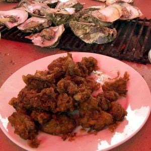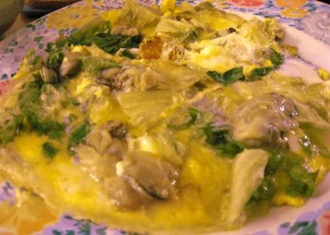 福州一带市面常见海蛎吃法还有蛎饼。旧时蛎饼做法,很是辛苦,我有亲戚,做此生意,往往早上天微亮,一家人就得起床,将头天晚上浸的大米、黄豆从水中捞起,然后套起石磨,用水将石磨清洗干净。石磨磨米须得两人,因石磨眼小,需要一人推磨,一人不停往磨眼添水添米,数九寒天,也不例外,添水之人,往往冻得跳脚搓手。米浆磨成,盛在一大铁盆或瓦缸中。将海蛎肉、猪瘦肉、小葱、韭菜(也有用白菜或紫菜)调成馅。浆和馅分列油锅两侧,油锅上架一密眼铁架,炸制蛎饼的人,左右各握一特制长柄瓢勺,左勺勺浆将右勺勺底铺满,铺上馅,再盖上米浆,伸右勺入沸油锅,炸至金黄,捞起放在铁架,食者自取。