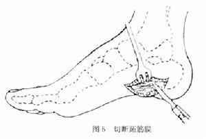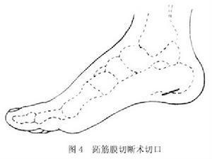 B.跖筋膜切断术:对足背部肌肉麻痹足底部肌腱挛缩引起高足弓或是马蹄内翻足者,可在足底内侧做一个0.8~1.5cm的小切口于皮下将挛缩的跖筋膜用尖刀切断以手指触之达到满意为止。术后以足踝石膏(靴状石膏)固定3~4周(图45)