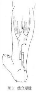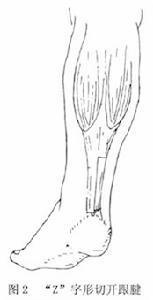 A.跟腱延长术:如图1~3所示,当患儿小腿伸肌群麻痹由于腓肠肌挛缩及肢体的重力作用引起足下垂时可采用将跟腱做“Z”字形切断延长的术式。术后下肢石膏固定3~4周疗效大多满意。