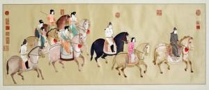 汴绣《虢国夫人游春图》八十年代汴绣在原有的基础上又大量开发了仿古长卷、装饰画、皮影画等题材。工艺上和其它绣种一样把历史上的双面绣发展为双面异色绣和双面三异绣,其代表作品如:异色绣中的《洛阳牡丹》;三异绣中的《中日友好》、《嫦娥奔月与天女散花》。同时汴绣也引起了法国、日本、瑞士、香港及东南亚地区的关注。