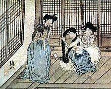 妓生的生涯(2)妓生通常是从小在教坊接受各种艺术训练,如乐器、书艺、舞蹈、文学、女红等,有些还包括医术,在宴会上提供表演和奉客。在古代,一个女孩要经过称为盘头的仪式、戴上加髢,才成为正式的妓生。