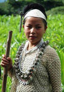 僜人服饰从从为数不多的衣着来看,女人一般都戴一对锋如长鼓似的银质长耳环,头戴护额,颈项挂串珠或其他银饰,穿统裙,赤足;男人头上都盘着长长的黑帕,戴一种银耳环,腰挎砍刀,十分威武。