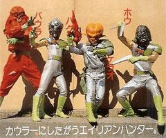 | 凯拉欧 用枪的好手。在兽战士基坦捕食的过程中负伤后,受到了梦想与宇宙人做朋友的孩子们和因他们改变念头的布的帮助。最后为了拯救被触手吸盘捕食的布,牺牲了自己。本作中唯一自己报出姓名的异形猎人。 |