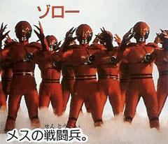 | 虫兵战士佐洛麦克斯帝国专属的战斗兵团,全都是借由行军蚁的基因而制成的,具昆虫般的面孔。右胸的蓝色球状人工心脏为其弱点。当怪兽战士诞生时,便率领它们去击败闪光人。能从口中吐出强酸性的溶解液和有快干性又黏力强的溶解丝。武器为嘴上的六根獠牙和双手上的利爪。 | ![]() |