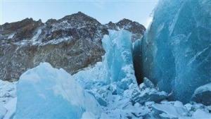 顾名思义,这种冰川的特点是冰川的末端悬挂在陡坡上。远远望去,成排的悬冰川就象一块块白色的盾牌挂在陡峭的山坡上。
