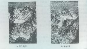 悬冰川的存在取决于冰斗冰川供给的冰量,容易形成,也容易消亡。冰斗冰川,分布在雪线附近呈斗状的洼地中,由冰雪积累而形成。冰斗冰川分布广泛,规模不大,大的可达数平方千米,小的不到1 km。其外形像一个汤匙,三面皆为陡峭的山坡环绕,只是在出口处流出短短的冰舌。[1]